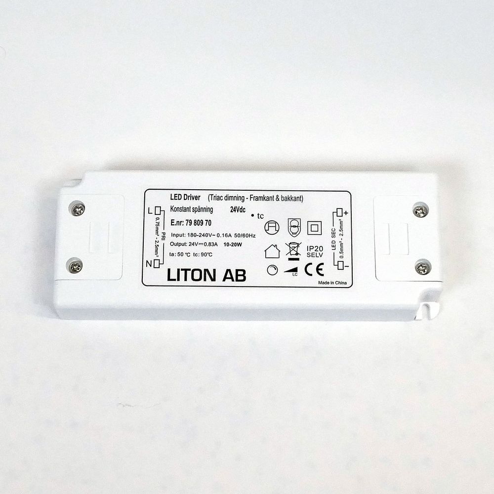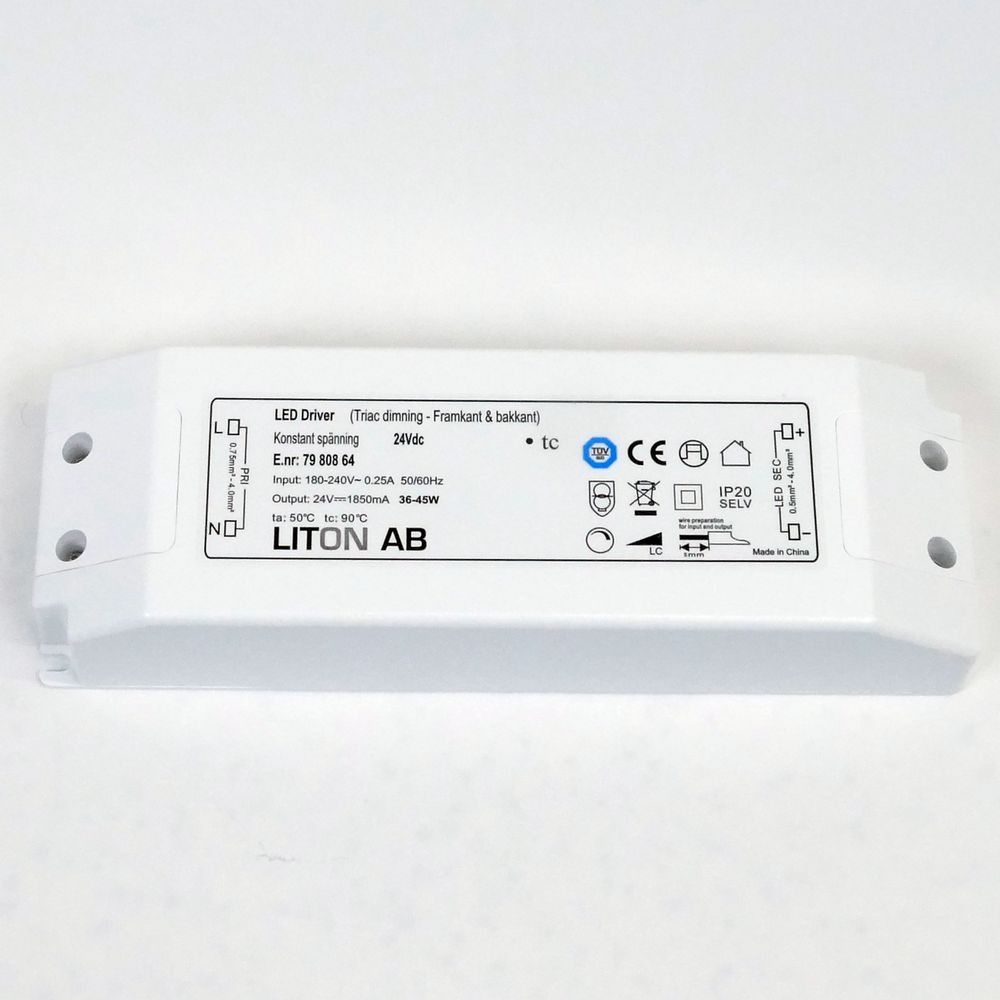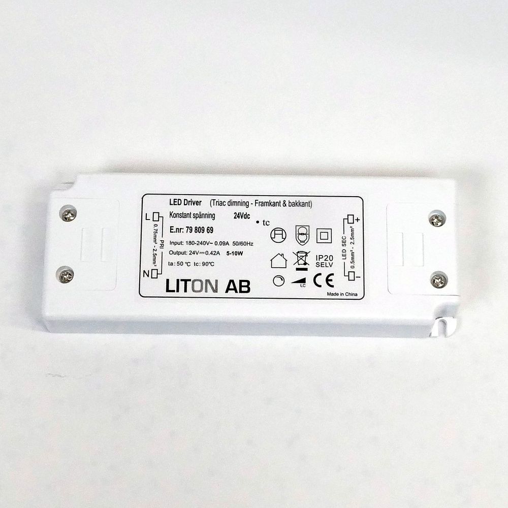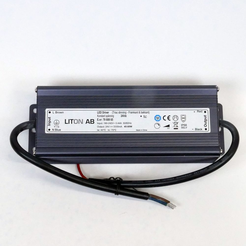 Dimbara transformatorer från Liton, avsedda för LED-belysning. Både framkant- och bakkantsdimring. Transformatorerna ger flimmerfritt ljus då de använder amplituddimring. De är kortlutnings- och överhettningsskyddade. Anslutning via skruvplint förutom 80W-typen som har korta kablar ut för både primär och sekundär-sida.